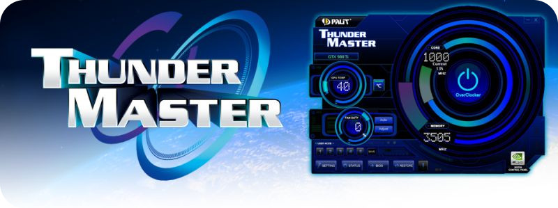 W celu zoptymalizowania rewolucyjnych funkcji serii GeForce® Palit stworzył narzędzie “ThunderMaster” dzięki któremu można maksymalnie podkręcić kartę. System ten w pełni obsługuje technologię NVIDIA GPU Boost w celu inteligentnego monitorowania taktowania zegara – zapewnia to bezpieczną pracę GPU przy wysokiej liczbie klatek na sekundę. Narzędzie to oferuje równiez nowy poziom dostosowywania ustawień, wliczając w to górną granicę temperatury GPU oraz kontrolę liczby klatek na sekundę.Palit ThunderMaster pozwala osiąganąć maksymalną wydajność w łatwy oraz skuteczny sposób.
