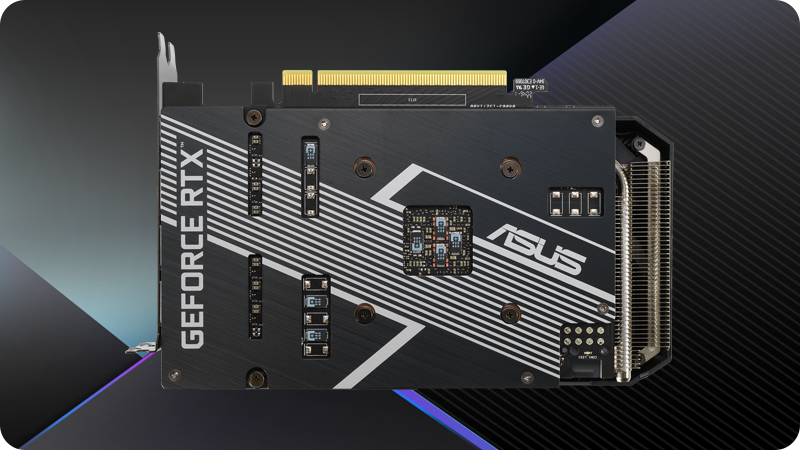 Tył karty Asus Dual GeForce RTX 3060 został wzmocniony przez wytrzymałą płytę nośną. Jej zadaniem jest usztywnianie i wzmocnienie konstrukcji mechanicznej, oraz dodanie walorów estetycznych. Wspornik montażowy został wykonany ze stali nierdzewnej 304, zapewniając jeszcze pewniejsze mocowanie karty. Twój komputer zasługuje na solidne i eleganckie komponenty.