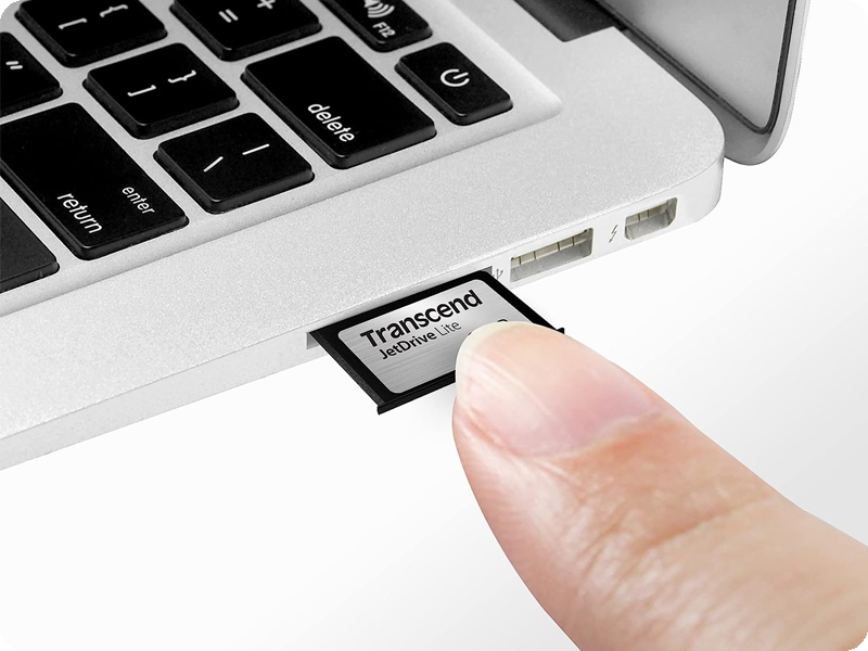 Transcend JetDrive Lite 330 to karta rozszerzeń, która stanowi szybki i łatwy sposób na uzyskanie dodatkowego miejsca na dane w Twoim laptopie MacBook Pro. Urządzenie ma płaską konstrukcję, dzięki której nie będzie Ci przeszkadzać podczas użytkowania, a szczególnie podczas wkładania laptopa do torby czy plecaka. Wystarczy, że włożysz kartę do gniazda czytnika kart z boku MacBook'a, co od razu zwiększy pojemność pamięci.