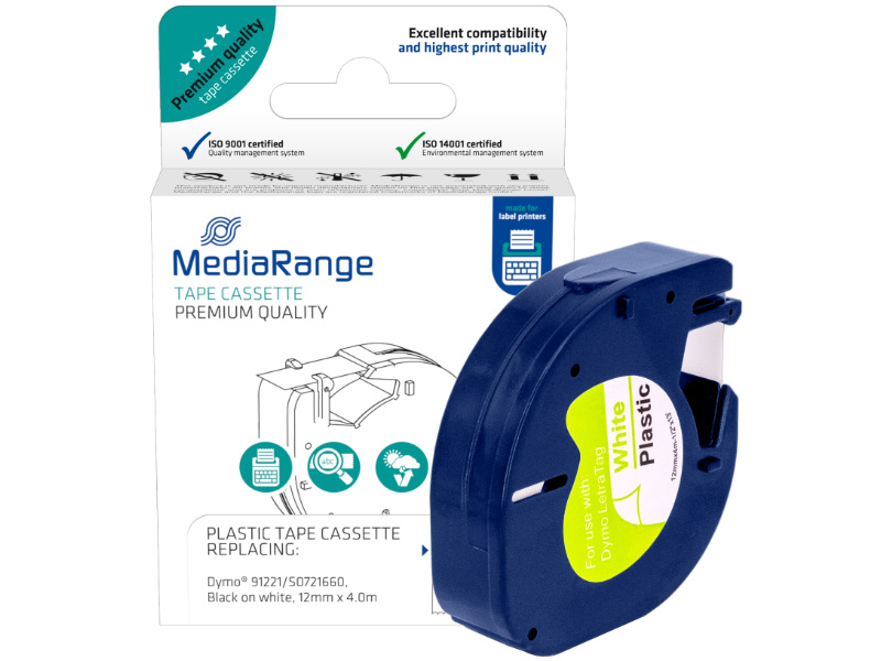 Biała taśma o szerokości 12 mm przystosowana do czarnego nadruku, długość 4 metry. Materiały eksploatacyjne firmy MediaRange zostały zaprojektowane w taki sposób, aby idealnie współpracowały z urządzeniami Dymo, co daje doskonałe rezultaty. Kasety od MediaRange charakteryzują się również doskonałą trwałością i jakością druku. Dodatkowo taśma wyposażona została w warstwę laminacyjną, która czyni druk odpornym na warunki atmosferyczne.