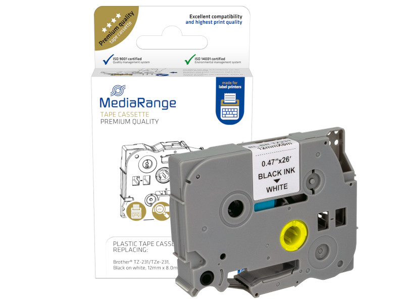 Taśma laminowana o szerokości 12mm, czarny nadruk /białe tło, długość: 8 metrów. Materiały eksploatacyjne firmy MediaRange zostały zaprojektowane w taki sposób, aby idealnie współpracowały z urządzeniami, co daje doskonałe rezultaty i stosunek ceny do jakości. Kasety od MediaRange charakteryzują się również doskonałą trwałością i jakością druku. Dodatkowo taśma wyposażona została w warstwę laminacyjną, która czyni druk odpornym na warunki atmosferyczne.