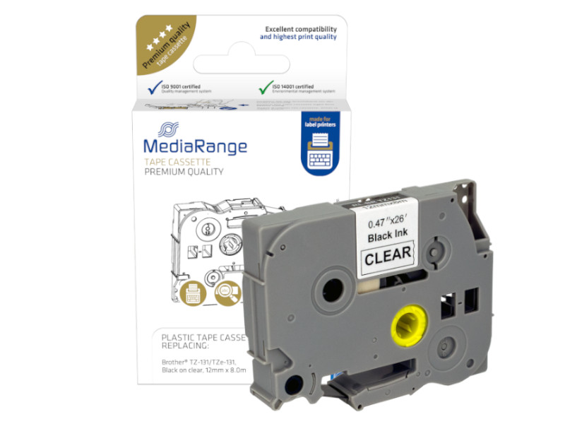 Taśma laminowana o szerokości 12mm, czarny nadruk /przezroczyste tło, długość: 8 metrów. Materiały eksploatacyjne firmy MediaRange zostały zaprojektowane w taki sposób, aby idealnie współpracowały z urządzeniami, co daje doskonałe rezultaty i stosunek ceny do jakości. Kasety od MediaRange charakteryzują się również doskonałą trwałością i jakością druku. Dodatkowo taśma wyposażona została w warstwę laminacyjną, która czyni druk odpornym na warunki atmosferyczne.