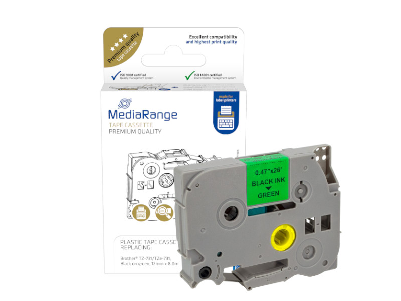 Taśma o szerokości 12 mm, czarny nadruk /Zielone tło, długość: 8 metrów. Materiały eksploatacyjne firmy MediaRange zostały zaprojektowane w taki sposób, aby idealnie współpracowały z urządzeniami, co daje doskonałe rezultaty i stosunek ceny do jakości. Kasety od MediaRange charakteryzują się również doskonałą trwałością i jakością druku. Dodatkowo taśma wyposażona została w warstwę laminacyjną, która czyni druk odpornym na warunki atmosferyczne.