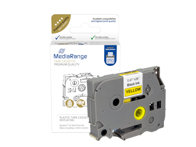 Taśma o szerokości 12 mm, czarny nadruk /żółte tło, długość: 8 metrów. Materiały eksploatacyjne firmy MediaRange zostały zaprojektowane w taki sposób, aby idealnie współpracowały z urządzeniami, co daje doskonałe rezultaty i stosunek ceny do jakości. Kasety od MediaRange charakteryzują się również doskonałą trwałością i jakością druku. Dodatkowo taśma wyposażona została w warstwę laminacyjną, która czyni druk odpornym na warunki atmosferyczne.