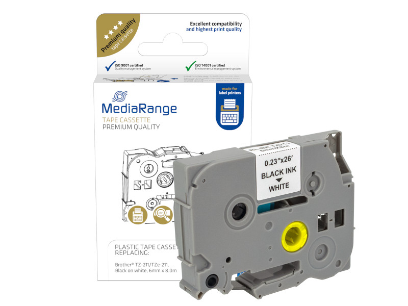 Taśma laminowana o szerokości 6mm, czarny nadruk /Białe tło, długość: 8 metrów. Materiały eksploatacyjne firmy MediaRange zostały zaprojektowane w taki sposób, aby idealnie współpracowały z urządzeniami, co daje doskonałe rezultaty i stosunek ceny do jakości. Kasety od MediaRange charakteryzują się również doskonałą trwałością i jakością druku. Dodatkowo taśma wyposażona została w warstwę laminacyjną, która czyni druk odpornym na warunki atmosferyczne.