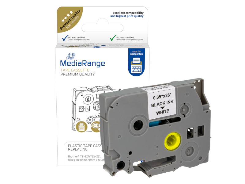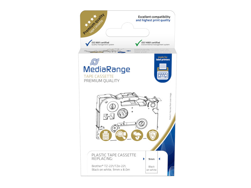 Taśma laminowana o szerokości 9mm, czarny nadruk /białe tło, długość: 8 metrów. Materiały eksploatacyjne firmy MediaRange zostały zaprojektowane w taki sposób, aby idealnie współpracowały z urządzeniami, co daje doskonałe rezultaty i stosunek ceny do jakości. Kasety od MediaRange charakteryzują się również doskonałą trwałością i jakością druku. Dodatkowo taśma wyposażona została w warstwę laminacyjną, która czyni druk odpornym na warunki atmosferyczne.