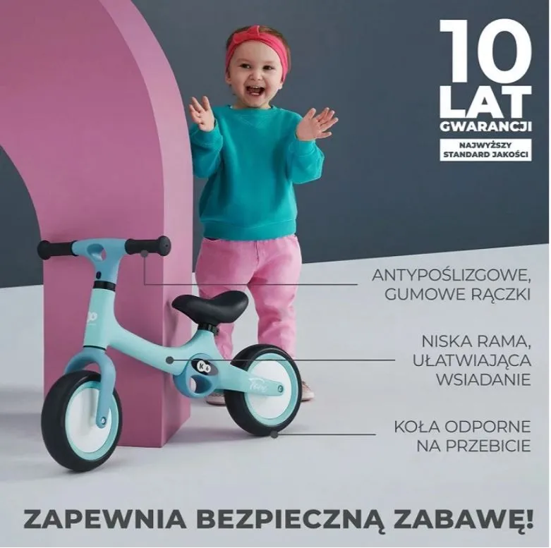 TOVE waży zaledwie 2 kg. Rowerek wykonany jest z wytrzymałego tworzywa PP i TPR - dzięki temu jest odporny na upadki, uderzenia i zarysowania.
