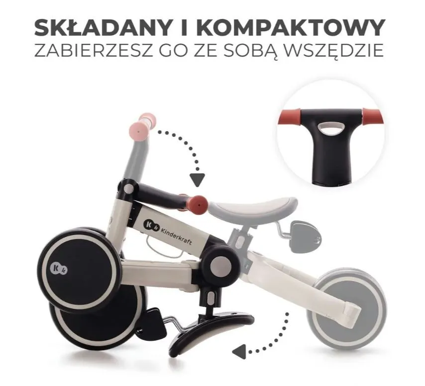 Rowerek składa się do kompaktowych rozmiarów i zmieści się nawet do kosza wózka dziecięcego. Niewielkie rozmiary sprawiają, że 4TRIKE po skończonej zabawie można schować do szafy czy postawić w kącie pokoju. Dodatkowo dzięki praktycznemu uchwytowi zabierzesz go ze sobą wszędzie.