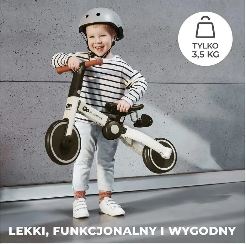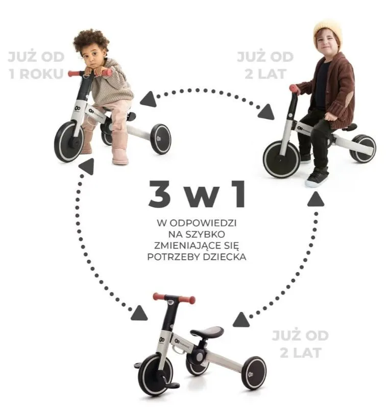 W funkcji jeździka zachęci malca do ćwiczenia naprzemiennego ruszania nóżkami, a w funkcji rowerka biegowego wspiera rozwój równowagi. Z kolei jako rowerek trójkołowy pomoże dziecku w przygotowaniu się do jazdy na dużym rowerze.