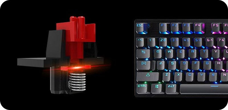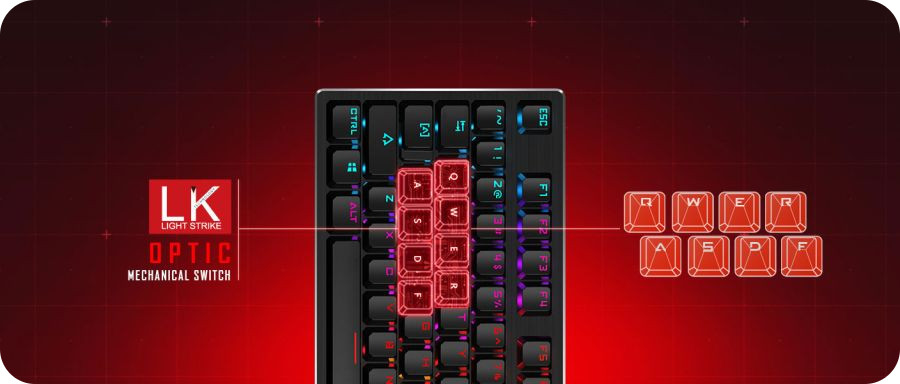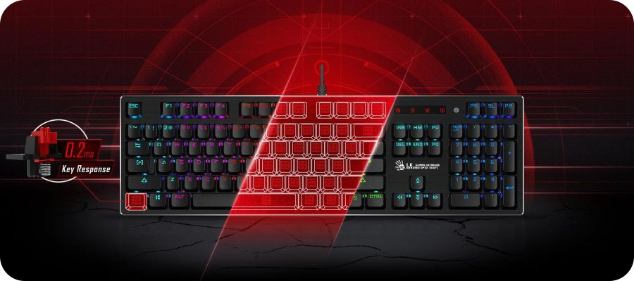 Innowacyjna technologia LK Optic Switch wykorzystuje przełącznik optyczny który reaguje z szybkością błyskawicy z ekstremalną reakcją na naciśnięcie klawisza - 0,2 ms, wyjątkowym "długotrwałym" dźwiękiem pisania i dotykowym sprzężeniem zwrotnym, co jest bardziej pasjonujące dla graczy.