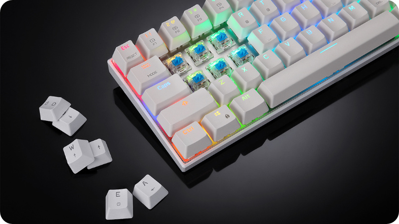 Motospeed CK62 to klawiatura w rozmiarze 60%. Oznacza to brak bloku numerycznego po prawej stronie klawiatury, brak klawiszy funkcyjnych oraz nawigacyjnych. Ich wyeliminowanie przekładające się na mniejsze rozmiary klawiatury oznaczaj, że prawa ręka zyskuje większy obszar do poruszania myszką podczas intensywnych rozgrywek. Dodatkowo ręce gracza mogą zostać bardziej zbliżone do siebie, pozwalając na bardziej naturalną pozycję siedzącą. Mniejszy rozmiar to również łatwiejszy transport, więc możesz cieszyć się bezkompromisowymi doznaniami gamingowymi również poza domem. Wszystkie z pozoru brakujące funkcje są dostępne po użyciu odpowiednich kombinacji klawiszowych.