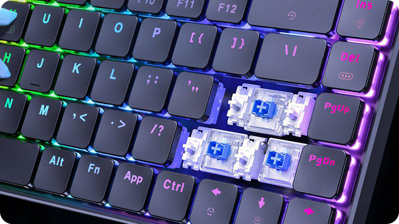 OUTEMU RED to rodzaj mechanicznych przełączników. Ich zaletami w porównaniu do klasycznego rozwiązania membranowego jest zauważalnie dłuższa żywotność oraz trwałość. Nawet po kilku latach pisania, klawisze zachowują się praktycznie tak samo, jak po pierwszym wyjęciu klawiatury z pudełka. Ich charakterystyczny klik oferuje pożądane przez wielu doświadczenia z pisania. Każde naciśnięcie klawisza jest akcentowane wyraźnym przeskokiem mechanizmu, który potwierdza zarejestrowanie ruchu.