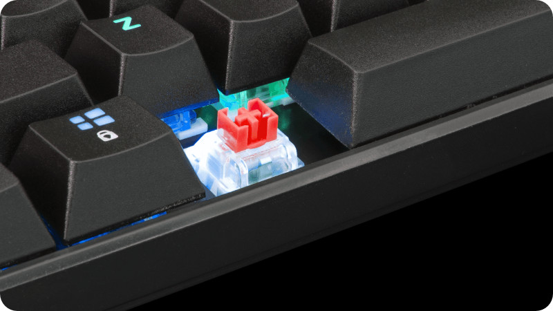 OUTEMU Red to rodzaj mechanicznych przełączników. Ich zaletami w porównaniu do klasycznego rozwiązania membranowego jest zauważalnie dłuższa żywotność oraz trwałość. Nawet po kilku latach pisania, klawisze zachowują się praktycznie tak samo, jak po pierwszym wyjęciu klawiatury z pudełka. Charakteryzują się cichą kulturą pracy i gładkim ruchem. Wciśnięcie klawisza jest jednostajne i pozbawione kliknięcia lub przeskoku. Jest to idealne rozwiązanie dla osób pracujących w cichym środowisku.