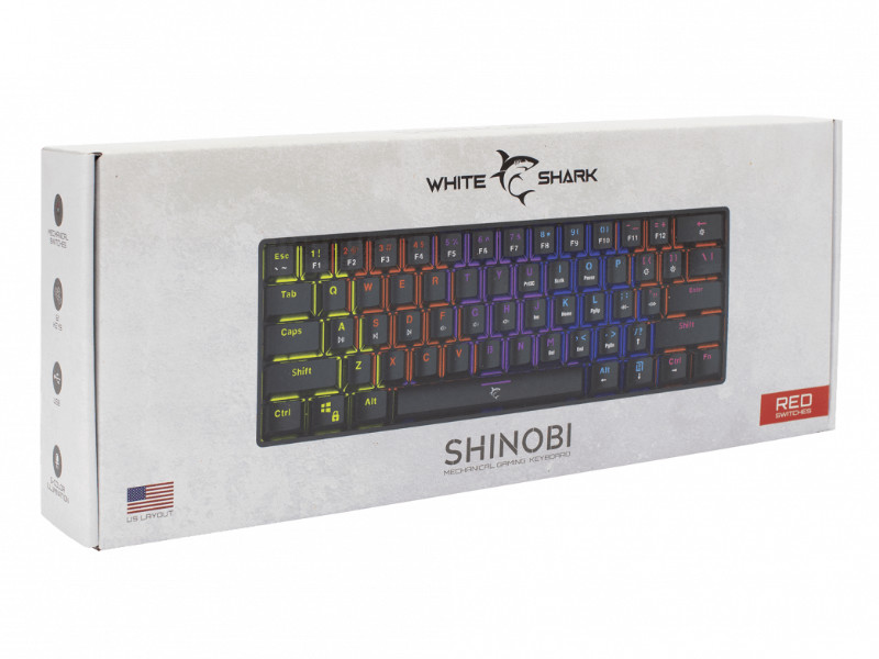WhiteShark Shinobi to klawiatura w rozmiarze 60%. Oznacza to brak bloku numerycznego po prawej stronie klawiatury, brak klawiszy funkcyjnych oraz nawigacyjnych. Ich wyeliminowanie przekładające się na mniejsze rozmiary klawiatury oznaczaj, że prawa ręka zyskuje większy obszar do poruszania myszką podczas intensywnych rozgrywek. Dodatkowo ręce gracza mogą zostać bardziej zbliżone do siebie, pozwalając na bardziej naturalną pozycję siedzącą. Mniejszy rozmiar to również łatwiejszy transport, więc możesz cieszyć się bezkompromisowymi doznaniami gamingowymi również poza domem. Wszystkie z pozoru brakujące funkcje są dostępne po użyciu odpowiednich kombinacji klawiszowych.