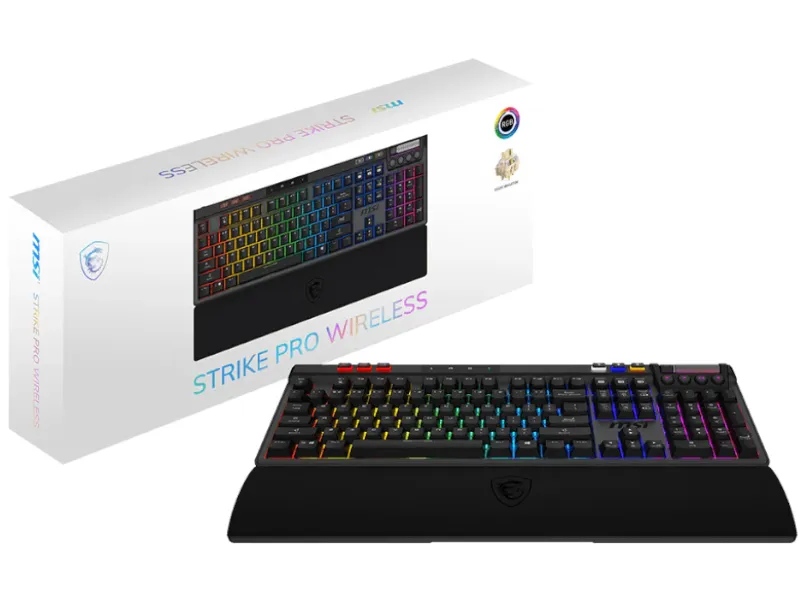 STRIKE PRO WIRELESS to klawiatura, która łączy w sobie charakteryzujące się cichą pracą mechaniczne przełączniki Kailh Midnight Pro, funkcję pozwalającą na ich łatwą wymianę „w locie” oraz możliwość współdziałania z komputerem w trzech trybach pracy. Dzięki nasadkom klawiszy wykonanym z tworzywa PBT (politereftalan butylenu), z nadrukowanymi na nich sublimacyjnie symbolami, indywidualnym podświetleniem RGB każdego klawisza oraz ergonomiczną konstrukcją z dołączaną magnetycznie podpórką pod nadgarstki, którą wykonano z pianki z efektem pamięci kształtu, klawiatura ta zapewnia użytkownikom wysoki komfort i ogromne możliwości personalizacji. Akumulator o pojemności 4200 mAh, inteligentne kółko przewijania oraz dołączone akcesoria sprawiają, że jest to idealna klawiatura do pracy i rozrywki.