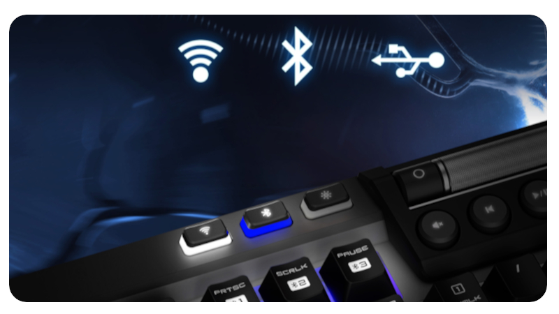 Klawiatura MSI Strike Pro W Silent US oferuje wyjątkową elastyczność związaną z podłączaniem jej do komputera lub do innych urządzeń. Użytkownik może skorzystać z trzech trybów komunikacji: bezprzewodowego, używającego pasma 2,4 GHz, Bluetooth oraz przewodowego USB Type-C. Co więcej, można do niej podłączyć jednocześnie do trzech urządzeń Bluetooth, przełączając się między nimi za pomocą klawiszy skrótów. Dzięki temu klawiatura idealnie nadaje się dla tych osób, które w ciągu dnia korzystają z wielu urządzeń, takich jak komputer, tablet czy telefon komórkowy.