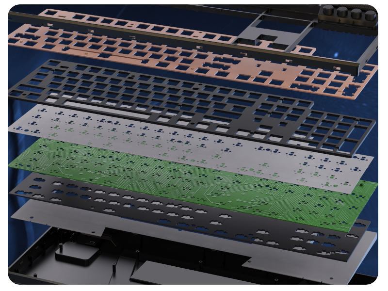 Klawiatura została stworzona z myślą o maksymalnym komforcie i absolutnej ciszy. Jej wielowarstwowa obudowa tłumiąca dźwięk wykorzystuje precyzyjnie zaprojektowane piankowe uszczelki, które skutecznie eliminują odgłosy stukania klawiszy, ograniczają pogłos i niwelują wszelkie rezonanse. Ta zaawansowana konstrukcja sprawia, że pisanie staje się zaskakująco ciche, miękkie i płynne, a każde naciśnięcie klawisza brzmi tak subtelnie, jak tego oczekujesz od sprzętu premium. Bezszelestna praca, zredukowany hałas i wyjątkowo przyjemne wrażenia z użytkowania – to klawiatura, która dba o Twój komfort na każdym poziomie.