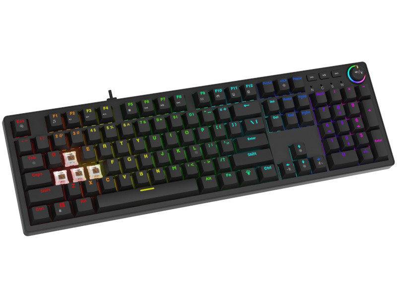 Klawiatura wykorzystuje przełączniki OUTEMU BROWN, które oferują płynne i miękkie działanie. Żywotność przełączników wynosi aż 50 milionów kliknięć, co zapewnia długotrwałą niezawodność. Efektowne podświetlenie RGB z 21 trybami wizualnymi pozwala dopasować wygląd klawiatury do nastroju, stylu stanowiska lub rodzaju gry. Dynamiczne efekty świetlne tworzą wyjątkowy klimat i dodają charakteru każdej rozgrywce.