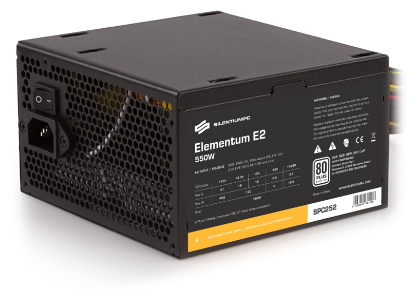 Zasilacz SilentiumPC Elementum E2 80+ Bronze 550 W to nowoczesna platforma. Zapewnia bardzo dobrą stabilność napięć, a także wysoką sprawność energetyczną przekraczającą 88%, co zostało potwierdzone certyfikatem 80 PLUS Bronze. Przekłada się to na niższe rachunki za energię elektryczną, niższe temperatury, cichsze działanie wentylatora oraz dłuższą bezawaryjną pracę.