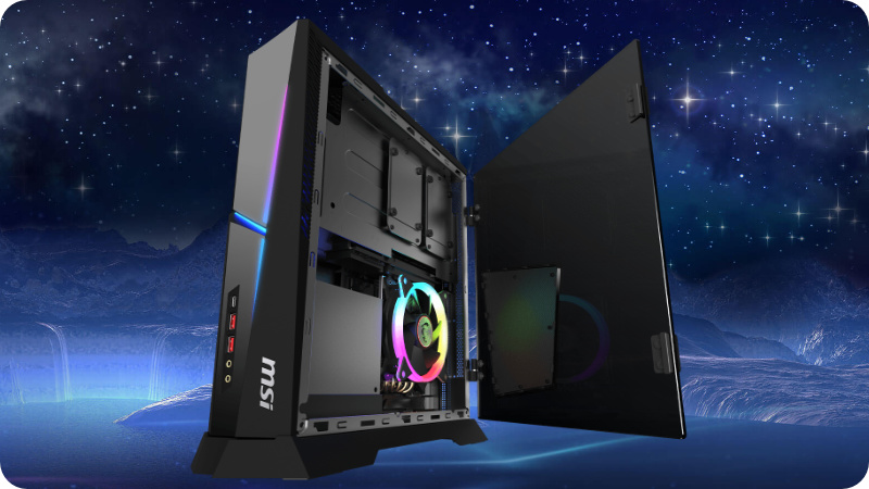 Umieszczony na zawiasie panel boczny wykonany ze szkła hartowanego pozwala podziwiać podświetlenie chłodzenia procesora, kiedy jest zamknięty. Otwierając go niczym drzwi zyskujesz dostęp do komponentów. Z łatwością wymień procesor, pamięć, dysk twardy. Zdejmując boczny panel po drugiej stronie komputera możesz wymienić kartę graficzną oraz wykorzystać dodatkowy slot na dysk M.2 SSD.