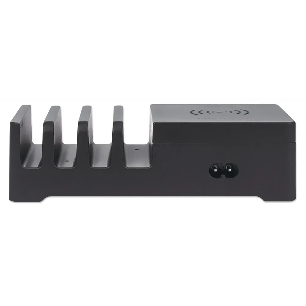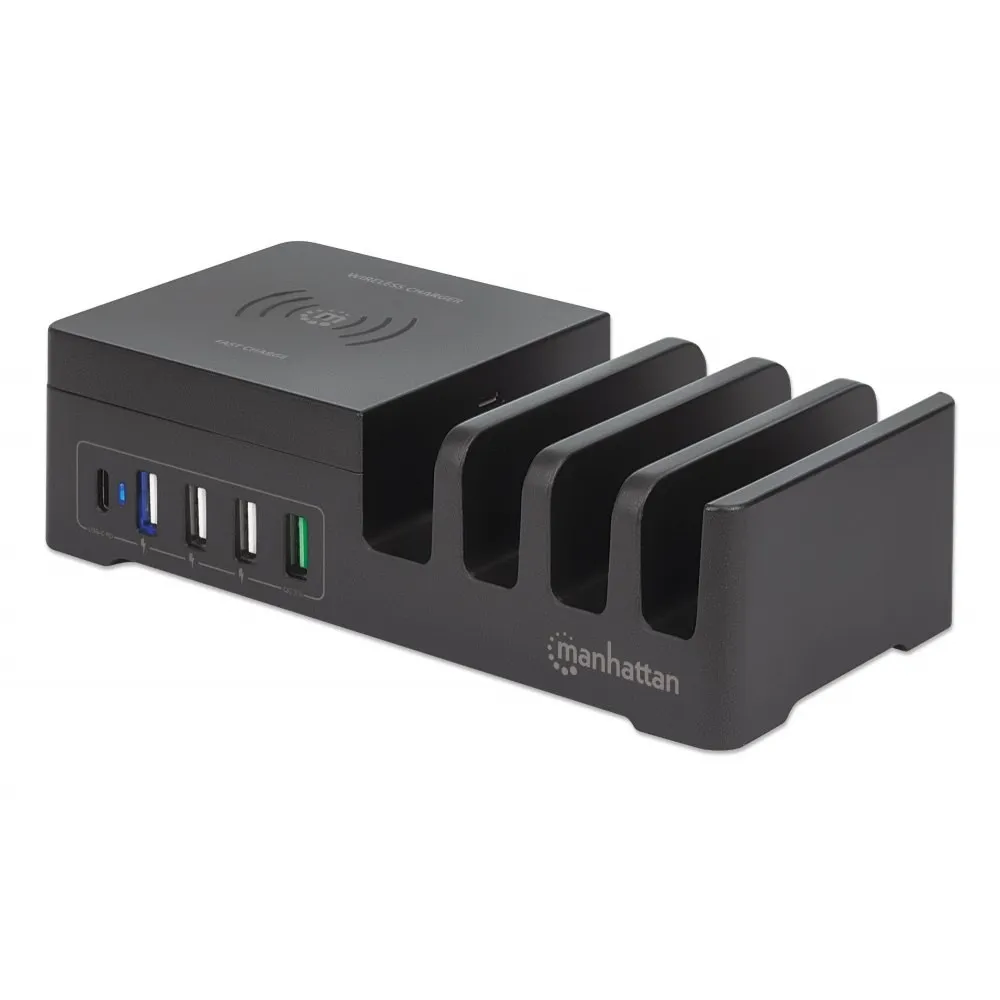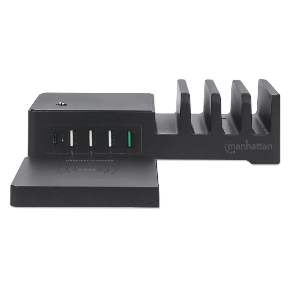 Manhattan 102230 Sieciowa Stacja Zasilająca, Ładująca 55W 1x USB-C PD 30W, 1x USB-A QC 3.0 18W, 3x USB-A 5V 2,4A (36W) oraz Bezprzewodowa Ładowarka Indukcyjna Qi 10W