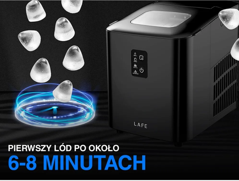Z kostkarką Lafe Ice Cube Maker nie musisz długo czekać na orzeźwienie. Pierwsza porcja lodu - aż 8 kostek - pojawia się już po około 6-8 minutach od uruchomienia. To idealne rozwiązanie na spontaniczne spotkania, domowe przyjęcia czy szybkie schłodzenie napojów w upalne dni.