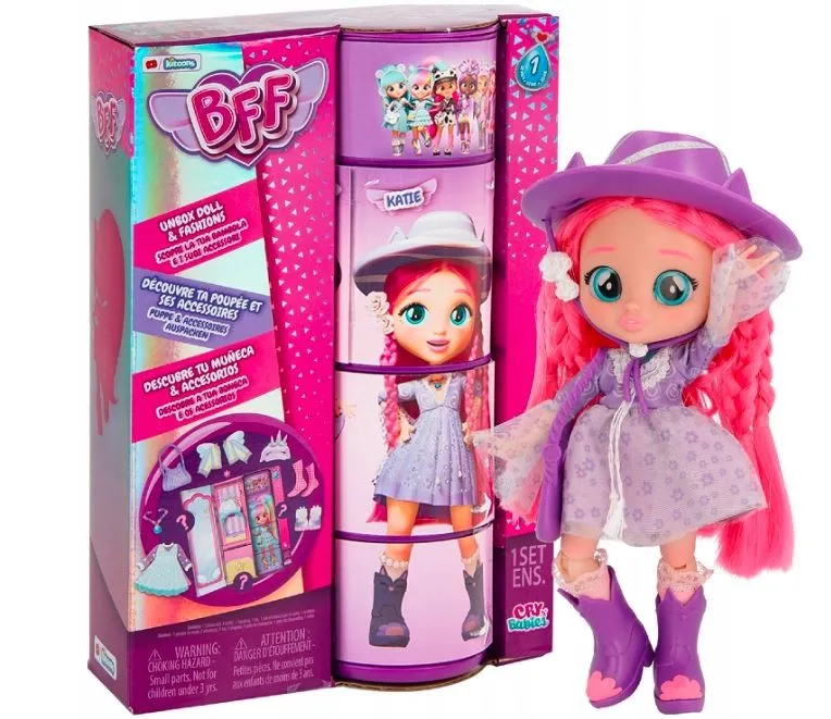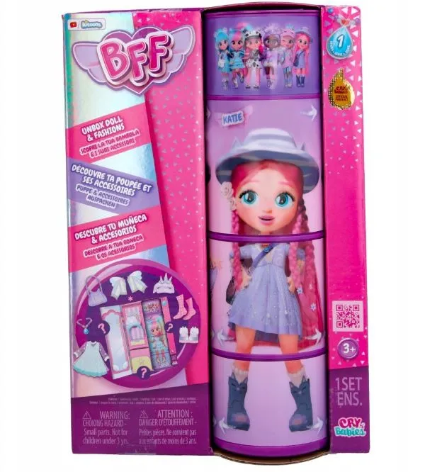 Poznaj nowe BFF Najlepsze Przyjaciółki! Teraz Twoje ulubione bohaterki z Cry Babies Magic Tears dorosły i są już nastolatkami! Mają 13 lat i czeka na nie wiele przygód. W kolekcji jest 6 lalek do zebrania, a każda z nich ubrana jest w trendy strój zgodny z ostatnim krzykiem mody. Mają 15cm wysokości, kolorowe włosy, kryształowe oczka i w pełni ruchome ciała. Którą Najlepszą Przyjaciółkę wybierzesz? Obróć tubkę, aby się przekonać! Odpakuj i odkryj ich garderobę razem z ponad 9 niespodziankami: 2 częściami stroju, torbą, opaską lub nakryciem głowy, parą dopasowanych bucików ze skarpetkami oraz naszyjnikiem! Lalki BFF mają jedwabiste, nylonowe włosy oraz prawdziwie modne stroje! Każda lalka zapakowana jest w jedyne w swoim rodzaju pudełko, które jest jednocześnie ich garderobą! Obróć kawałkami tuby, aby odkryć różne pozy, które może przybrać Twoja Najlepsza Przyjaciółka!
