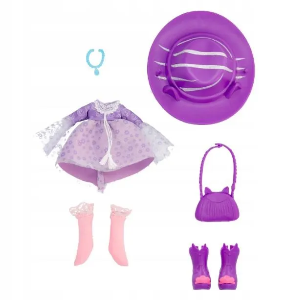 Dotty ma stylowe, kolorowe włosy, kryształowe oczka i ruchome ciało! Nosi modny strój i specjalny naszyjnik sukienkę w kropki z metaliczną skórzaną kurtką, buty Maryjane na koturnie i skarpetki w kratkę! Dodaj jej torebkę na ramię, uroczą czapkę z uszami psa oraz dopasowany naszyjnik BFF!