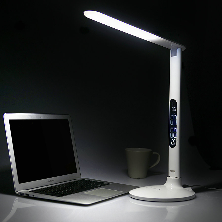 Biurkowa lampa LED 10W z możliwością wyboru barwy światła oraz wyświetlaczem LCD z zegarem, kalendarzem i termometrem oraz portem USB do ładowania telefonu, itp.