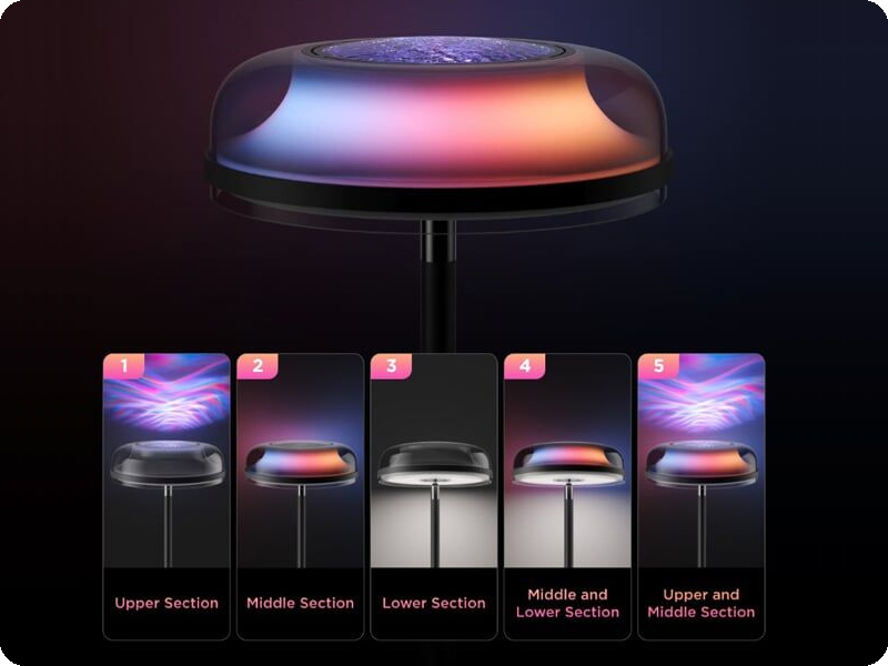 Lampa oferuje dwa tryby oświetlenia – górne światło RGBWW, które zapewnia kolorowe efekty, oraz dolne światło WW o jasności 1000 lumenów, które jest idealne do codziennego użytku. Takie połączenie umożliwia stworzenie w pomieszczeniu różnych atmosfer w zależności od pory dnia i Twoich potrzeb. Dzięki regulacji jasności i kolorów możesz dopasować światło do aktualnych warunków.