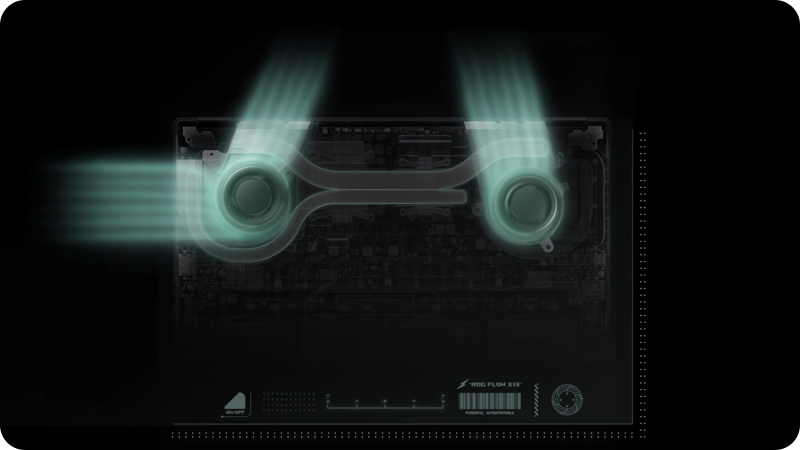Aby uzyskać high-endową wydajność w urządzeniu z ekranem 13”, precyzyjnie dostosowaliśmy każdy aspekt naszego układu chłodzenia. Opracowany przez nas samooczyszczający się moduł chłodzenia jest wyposażony w płaskie rurki cieplne podłączone do pełnowymiarowych radiatorów, których w tym laptopie jest więcej niż w standardowych urządzeniach. Ponadto środek termoprzewodzący z płynnego metalu pomaga utrzymać optymalne temperatury pracy procesora. Ten kompleksowy układ chłodzenia pozwala Ci osiągnąć większą wydajność stabilnie przez dłuższy czas.