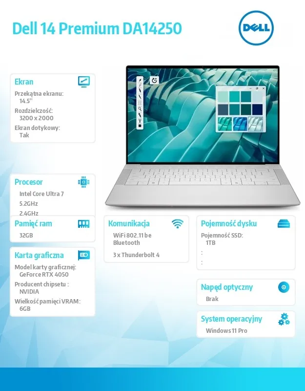 Opis dotyczy serii notebookĂłw Dell 14 Premium DA14250. Rzeczywiste cechy mogÄ siÄ róşniÄ w zaleĹźnoĹci od konfiguracji notebooka.