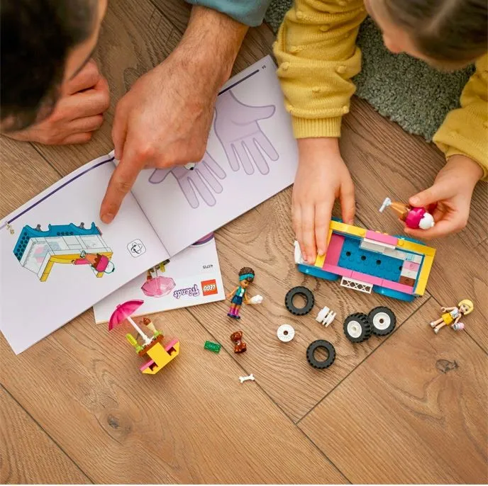 Kreatywny prezent pełen elementów - w zestawie są Andrea i Roxy z LEGO Friends, figurka psa i wszystkie klocki niezbędne do zbudowania kolorowej furgonetki z lodami.