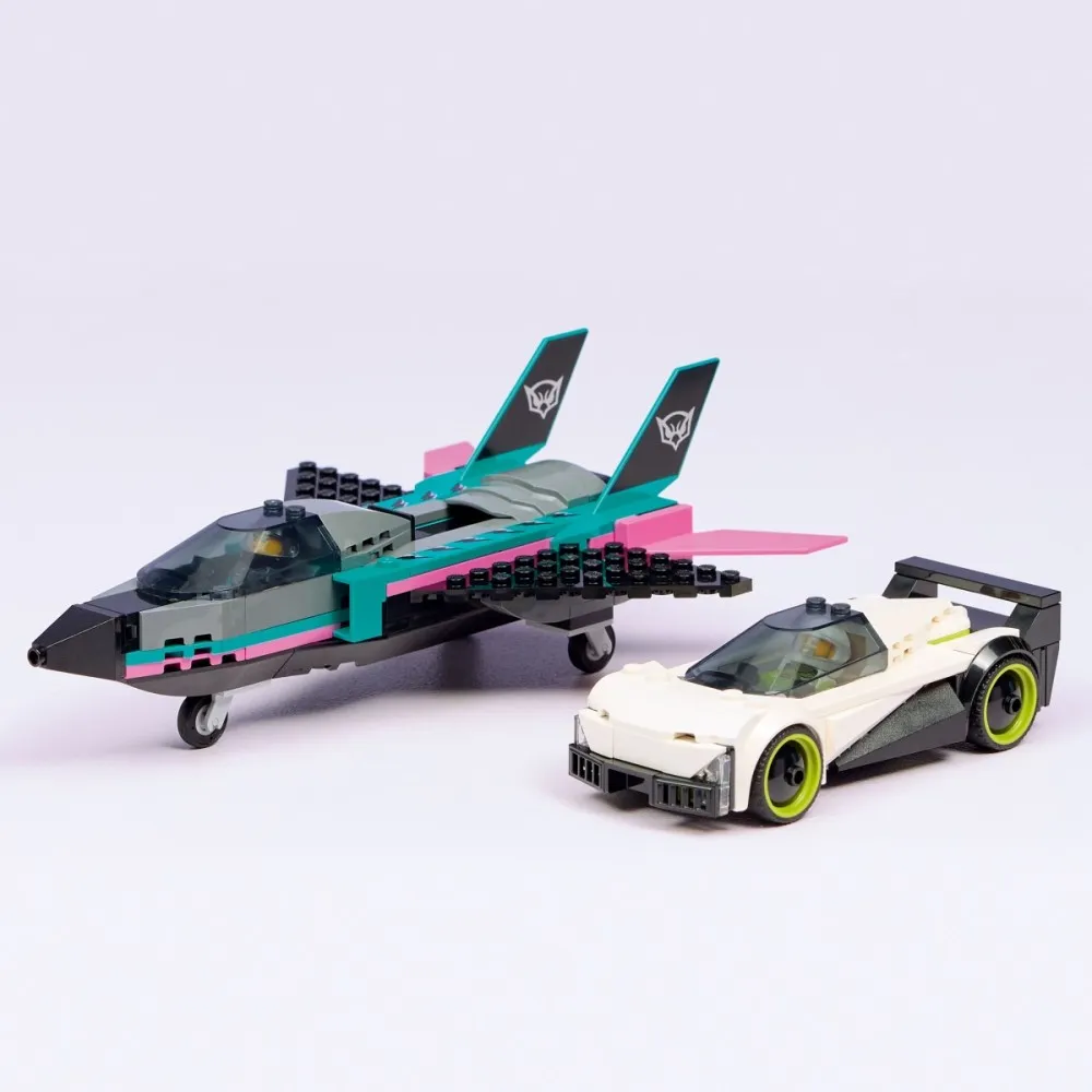 Ten podwójny zestaw LEGO City Odrzutowiec kontra samochód (60489) zawiera elegancki supersamochód i naddźwiękowy odrzutowiec, które zapewnią mnóstwo frajdy podczas wyścigów. Zabawkowy odrzutowiec ma skośne skrzydła, podwójne pionowe stateczniki i stabilizatory. Dzieci mogą przesunąć dźwignię, aby włączyć dopalacze odrzutowca i otworzyć kokpit supersamochodu, aby zajrzeć do szczegółowego wnętrza z fotelem wyścigowym. Wystarczy dodać minifigurki pilota i kierowcy, aby przeżyć wiele godzin epickiej akcji wyścigowej.