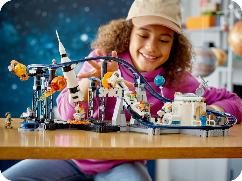 Każdy z wariantów zapewnia nowe doświadczenia i godziny kreatywnej zabawy, a świecący klocek dodaje zestawowi niezwykłego, futurystycznego klimatu. W zestawie znajduje się pięć minifigurek: astronauta, naukowiec, tata z dwójką dzieci oraz mały astronauta. Dzięki nim mali konstruktorzy mogą odgrywać niezliczone scenki, wcielając się w role uczestników kosmicznej przygody. Zestaw wspiera rozwój wyobraźni, kreatywności oraz zdolności manualnych, zachęcając dzieci do samodzielnego tworzenia historii. Budowanie ułatwia aplikacja LEGO® Builder, dzięki której można zapisywać postępy, a także przybliżać i obracać model w trójwymiarze. Po skończonej zabawie zestaw stanie się wspaniałą ozdobą dziecięcego pokoju – ma 27 cm wysokości, 27 cm szerokości i 55 cm głębokości. LEGO® Creator Kosmiczna kolejka górska to idealny prezent dla dzieci od 9 roku życia, które uwielbiają twórcze wyzwania, konstrukcje typu 3 w 1 i tematy kosmiczne.
