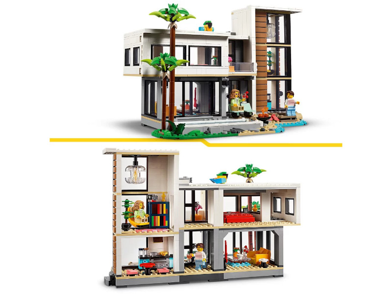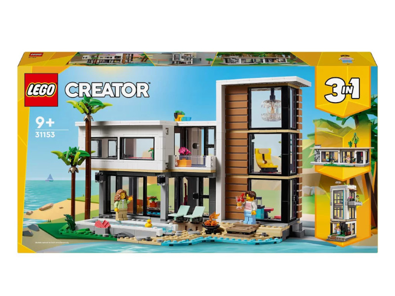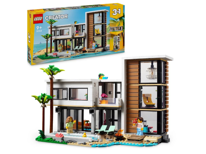 Zestaw LEGO® Creator 3w1 Nowoczesny dom (31153) pozwala dzieciom od 9 roku życia odkrywać świat architektury i kreatywnej zabawy, oferując możliwość zbudowania aż trzech różnych modeli z tych samych klocków. Główny model to luksusowy, dwupiętrowy dom na plaży z basenem, położony w cieniu dwóch palm, z kuchnią, salonem, czytelnią, sypialnią, łazienką z prysznicem, balkonem i nowoczesnymi meblami, w tym fotelem i żyrandolem. Zestaw można przebudować na stylową, trzypiętrową kamienicę z jacuzzi i tarasem na dachu lub zmienić go w urokliwą leśną chatkę.