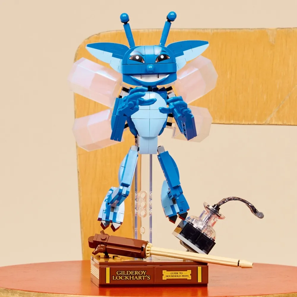 Ustaw chochlika kornwalijskiego w locie na przezroczystej podstawce lub postaw go w pozycji stojącej i baw się nim samodzielnie. Ten zestaw konstrukcyjny dla dzieci zawiera również kultowe akcesoria: książkę Gilderoya Lockharta do zbudowania wraz z butelką rozlanego atramentu.