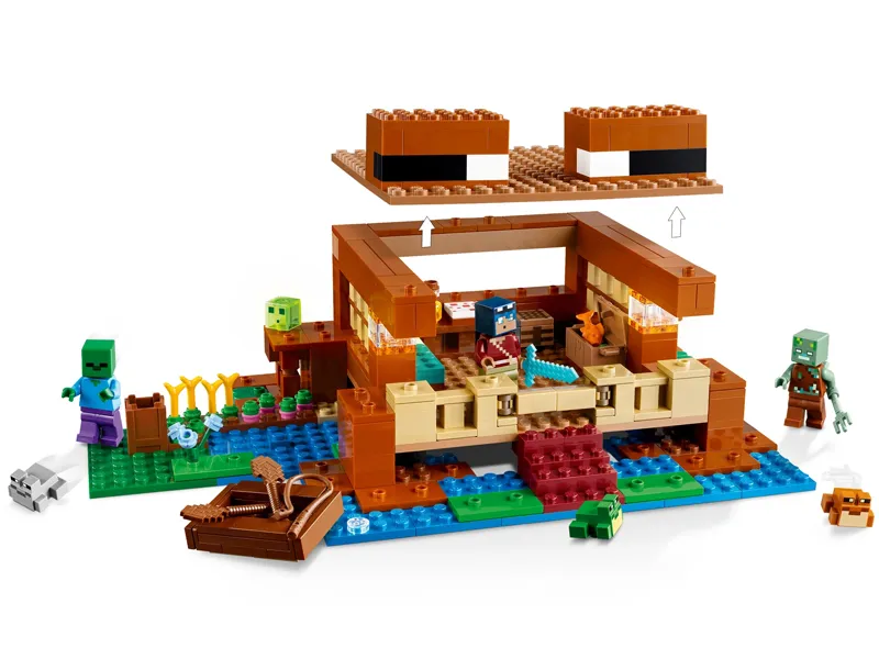Zestaw LEGO Minecraft “Żabi domek” to kreatywna zabawka dla dzieci od 8. roku życia, która przenosi świat gry Minecraft w realny, budujący sposób. Głównym elementem konstrukcji jest domek w kształcie żaby – z mieszkaniem wewnątrz, gdzie znajdują się między innymi łóżko, stół zwykły i warsztatowy, piec oraz skrzynia, a także dodatki takie jak ciasto i miód. Dach domu można zdjąć lub podnieść, co ułatwia dostęp do wnętrza i zabawę figurkami. Na zewnątrz domku znajduje się farma z uprawą buraków, pszenicy i kwiatów, a także jeziorko z małą łódką i wędką, co dodaje zestawowi naturalnego, przygodowego klimatu. Całość składa się ze 400 elementów, co pozwala na solidną zabawę i zadowalające wykonanie modelu.