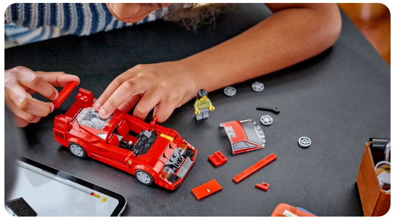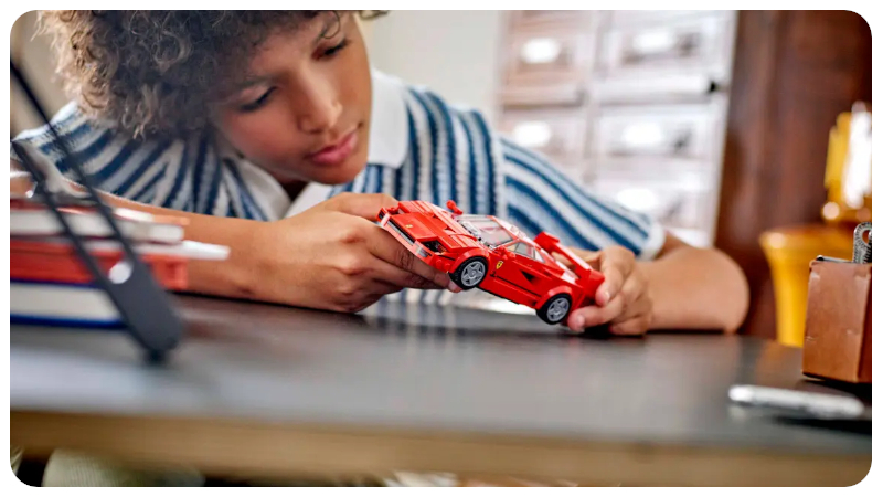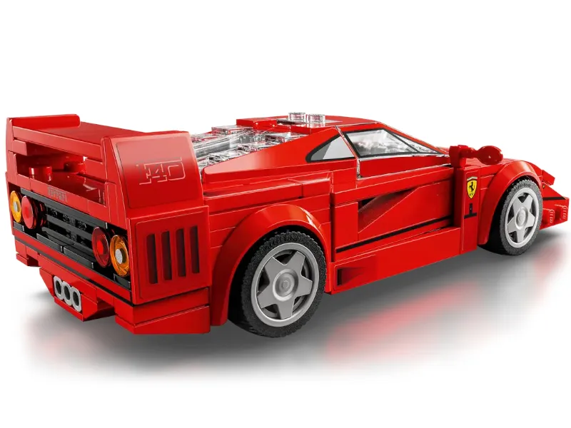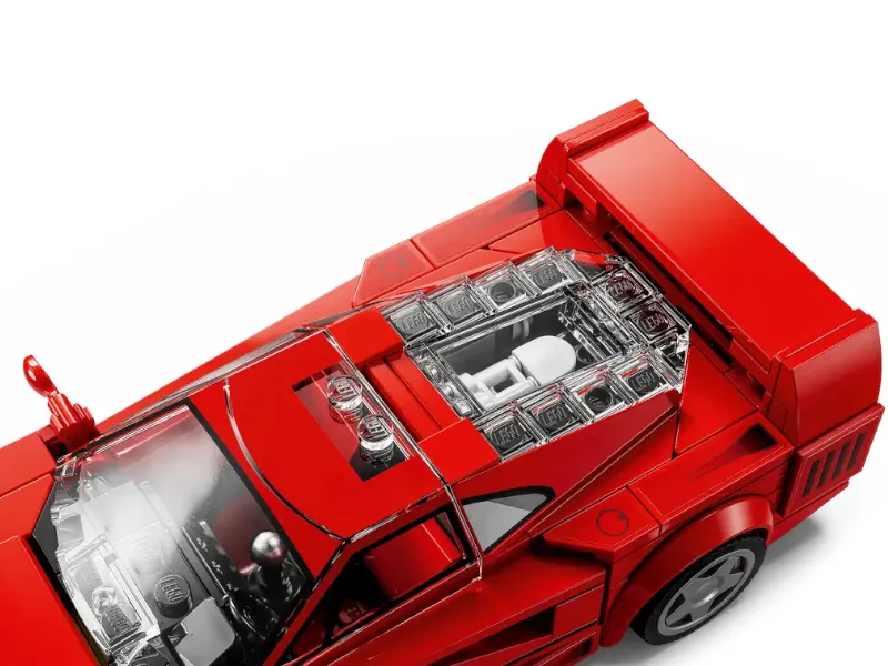 Ferrari posiada charakterystyczny dla F40 tylny spojler, maskę, rury wydechowe, felgi, elementy wlotu powietrza oraz wnętrze z deską rozdzielczą, hamulcem ręcznym, dźwignią zmiany biegów, czerwonymi fotelami i kierownicą. W zestawie jest także minifigurka kierowcy Ferrari, którą dzieci mogą posadzić za kierownicą. Dzięki zestawom konstrukcyjnym LEGO Speed Champions dzieci i automaniacy mogą budować repliki kultowych pojazdów. Każdy zestaw można zbudować, korzystając z aplikacji LEGO Builder, która poprowadzi Ciebie i Twoje dziecko przezłatwe i intuicyjne budowanie.