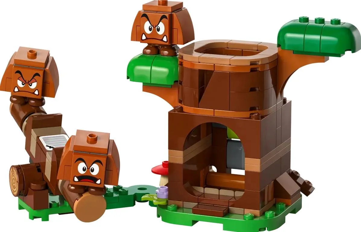 - Zabawka z klocków LEGO - naciśnij dźwignię z tyłu pnia drzewa, aby Goomba z niego wyskoczył lub pobaw się Goombami na huśtawce