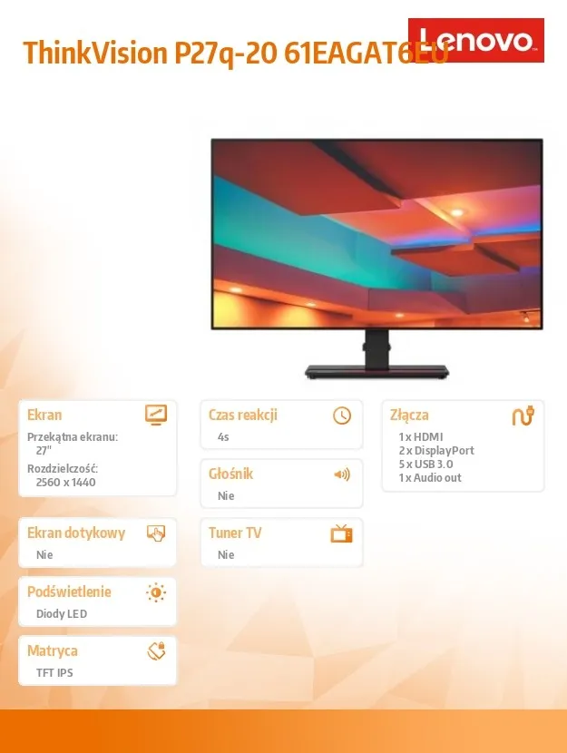 Peryferia i eksploatacjaMonitoryMonitoryLenovo Monitor 27 ThinkVision P27q-20 LCD 61EAGAT6EU