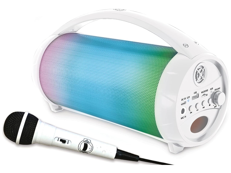 Ten świecący głośnik z mikrofonem i z wielobarwnymi efektami świetlnymi jest idealnym dodatkiem na imprezę karaoke i dla wszystkich, którzy lubią śpiewać kiedykolwiek i gdziekolwiek. Niesamowite efekty świetlne pozwolą Ci zawsze i wszędzie stworzyć imprezową atmosferę. Głośnik pozwala łączyć się bezprzewodowo ze smartfonami, tabletami i innymi urządzeniam audio wyposażonymi w technologię Bluetooth. Mikrofon zawarty w zestawie pozwoli Ci śpiewać ulubione piosenki, abyś poczuł się jak gwiazda. Urządzenie wyposażone jest w port USB i port kart micro SD / TF (do 32 GB). Natomiast wydajny akumulator zapewni Ci wiele godzin świetnej zabawy. Dzięki funkcji TWS można zsynchronizować dwa głośniki (drugi głośnik nie jest częścią zestawu) i cieszyć się doskonałym dźwiękiem stereo. Będziesz miał wrażenie, że muzyka gra "na żywo" w Twoim domu.