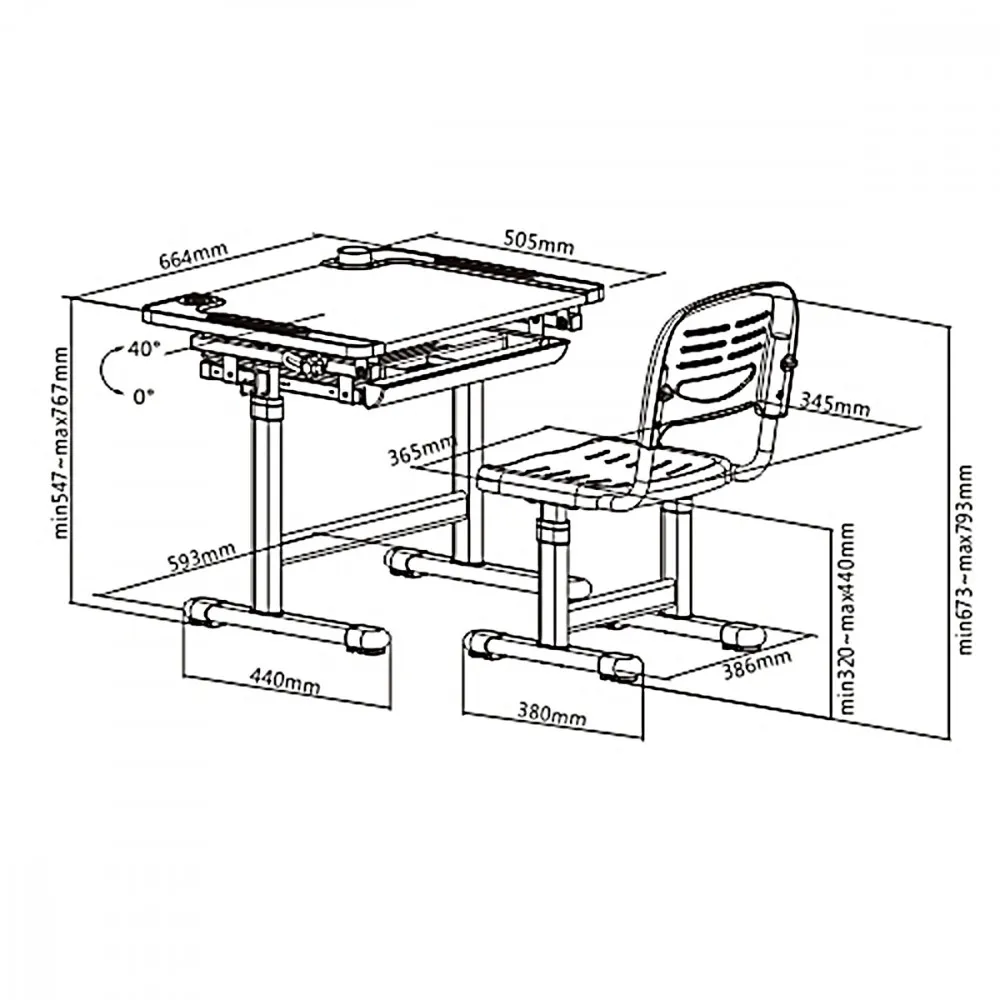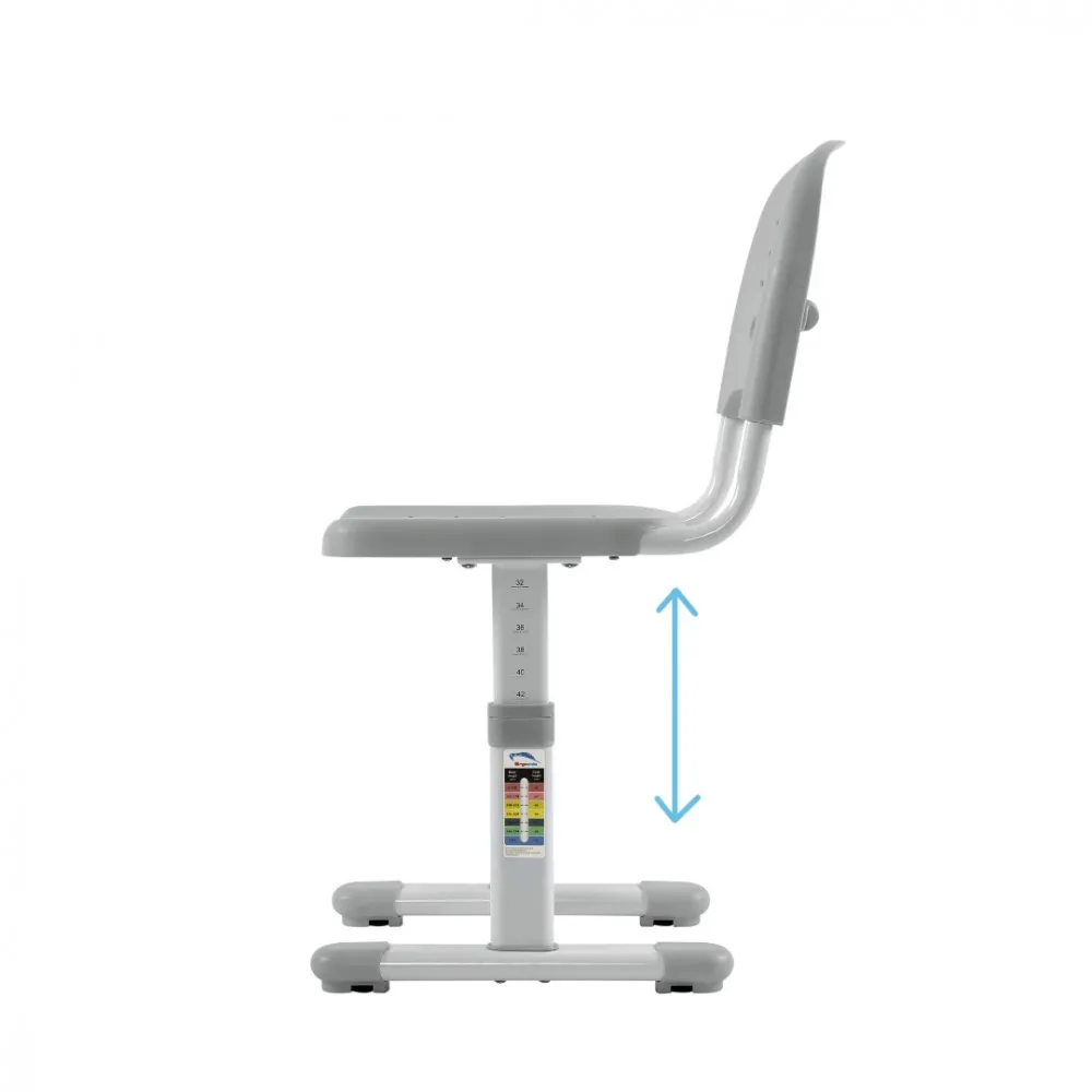 Ergonomiczne biurko z regulacją wysokości umożliwiającą dostosowanie do wzrostu dziecka. Zarówno na krzesełku jak i biurku znajdują się naklejki z zaleceniami ułatwiającymi regulację wysokości w zależności od wzrostu dziecka. Dzięki dużej powierzchni biurko ma uniwersalne zastosowanie. Idealnie nadaje się nie tylko do nauki, ale również do pisania, rysowania, czytania, malowania.