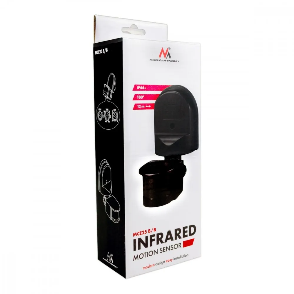 Czujnik ruchu PIR 180° funkcjonalna kontrola oświetlenia Czujnik ruchu Maclean MCE25 to praktyczne rozwiązanie do automatycznego sterowania oświetleniem w przestrzeniach wewnętrznych oraz zewnętrznych. Dzięki kątowi wykrywania 180° oraz regulowanemu zasięgowi detekcji od 5 do 12 metrów, urządzenie pozwala precyzyjnie dopasować obszar działania do wielkości monitorowanej przestrzeni. Regulowana, obrotowa głowica sensora umożliwia dokładne ustawienie pola wykrywania ruchu, co zwiększa skuteczność działania i ogranicza niepożądane aktywacje. Obudowa o klasie szczelności IP44 chroni czujnik przed bryzgami wody oraz ciałami obcymi, dzięki czemu doskonale sprawdzi się w pomieszczeniach oraz miejscach takich jak zadaszone tarasy, wiaty czy strefy wejściowe. Estetyczne, dyskretne wykonanie sprawia, że czujnik dobrze komponuje się z różnymi typami aranżacji.