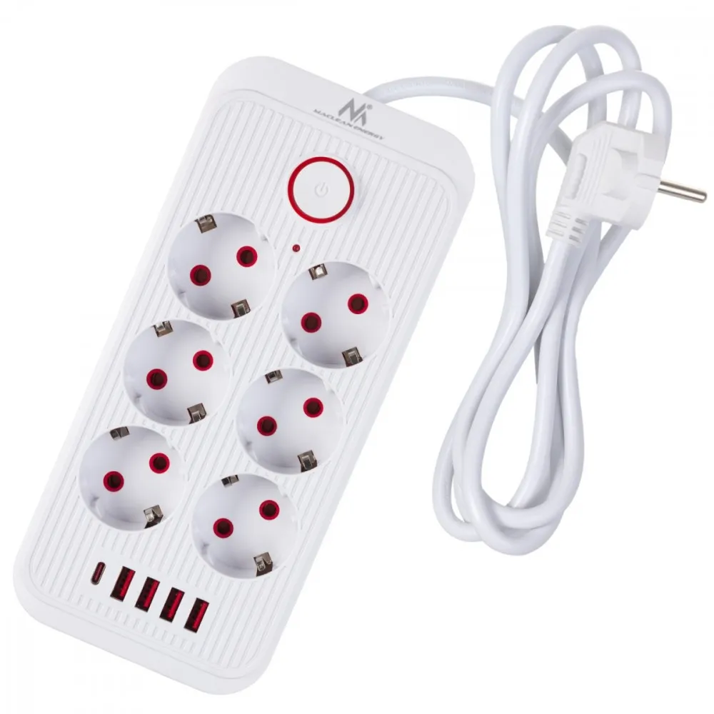 Maclean Listwa zasilająca MCE389 W 6 gniazd 4xUSB-A 1xUSB-C 110-240V, AC 50/60Hz, 2.1A max 2500W biała