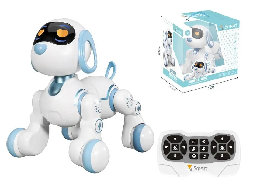 Cyber Pies R/C Oczy LED EMOTIONS Porusza się do przodu, do tyłu, w lewo, w prawo, tańczy, funkcja demo, możliwość programowania 30 sekwencji ruchu. Muzyka, dźwięki, siada, szczeka, ładowanie USB. Cyber Pies zawiera beterię 3,7V 600 mAh Li-ion i kabel USB. W zestawie pilot sterujący bez baterii.