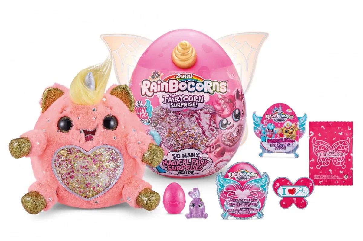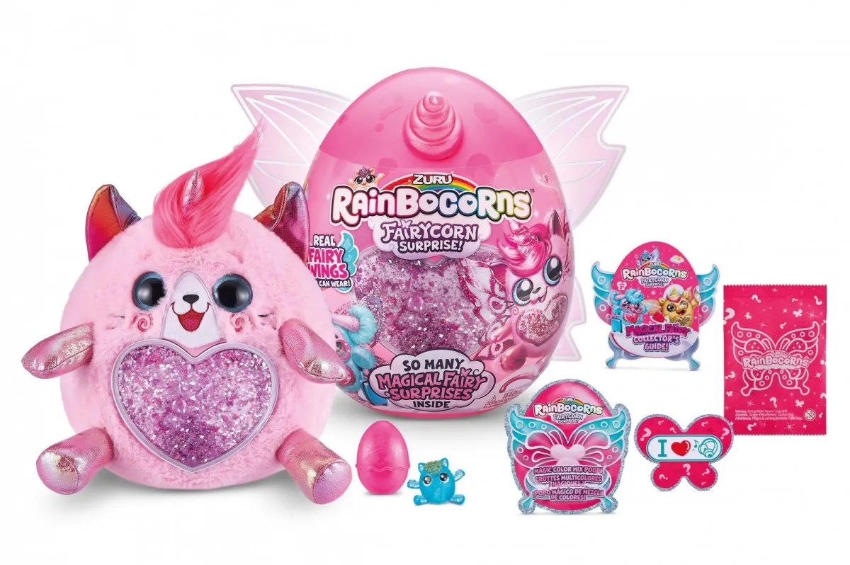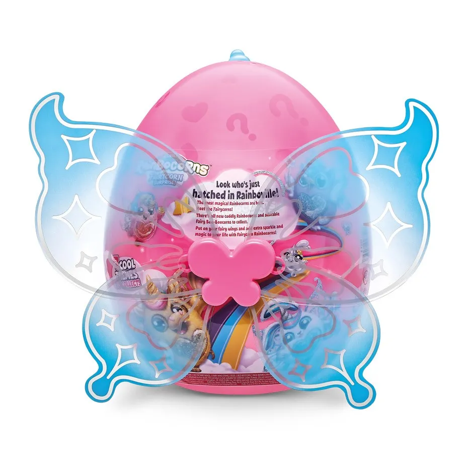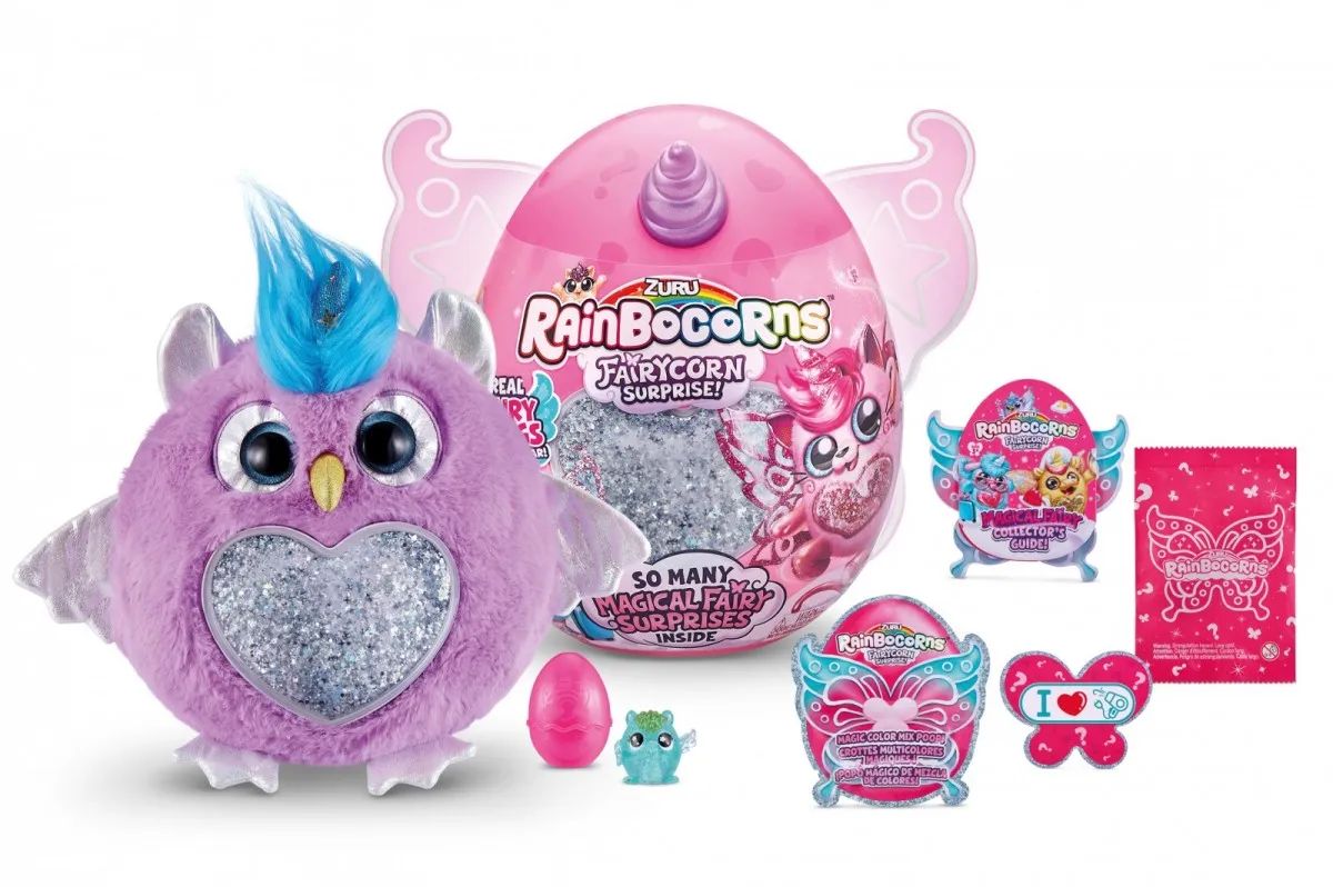Rainbocorns Fairycorn Surprise Pluszowe, przytulaśne maskotki z małymi bajkowymi skrzydełkami. W serii znajdziecie, aż 7 różnych zwierzątek m.in.: sówkę, zajączka , hipcia czy owieczkę. Częścią opakowania jest ogromne brokatowe serce, które można wyjąć i umieścić na brzuszku maskotki, a może też służyć jako broszka lub zapinka do włosów. Na opakowaniu zamocowane są duże skrzydełka, które dzięki specjalnej gumce mogą nosić dzieci. Oprócz maskotki, w jajku ukryte jest mnóstwo niespodzianek: mini figurka Boo-boocorn, kupka jednorożca (glutek) i ulotka dzięki której dowiecie się co najbardziej lubi wasz pluszak. Ilość dostępnych maskotek niespodzianek to 7, każde jajko ma inny kolor rogu/uszek oraz kolor brokatowego serca. Produkt wysyłany losowo, brak możliwości wyboru konkretnego modelu. Cena dotyczy 1szt. |