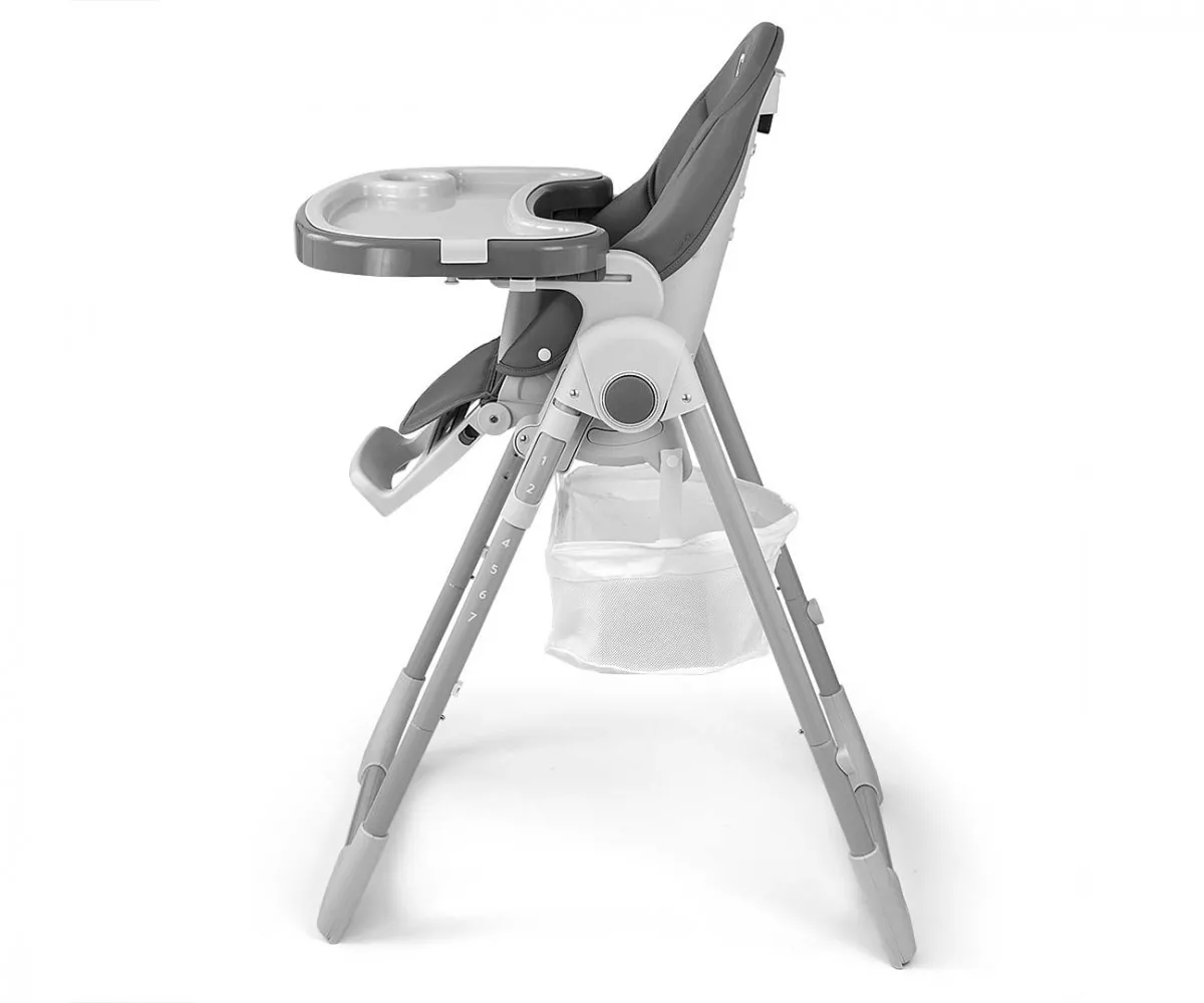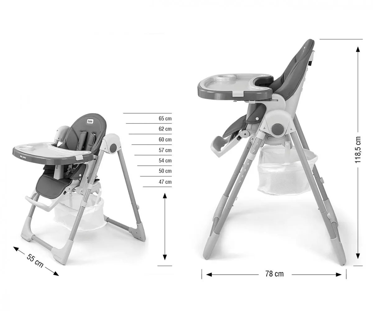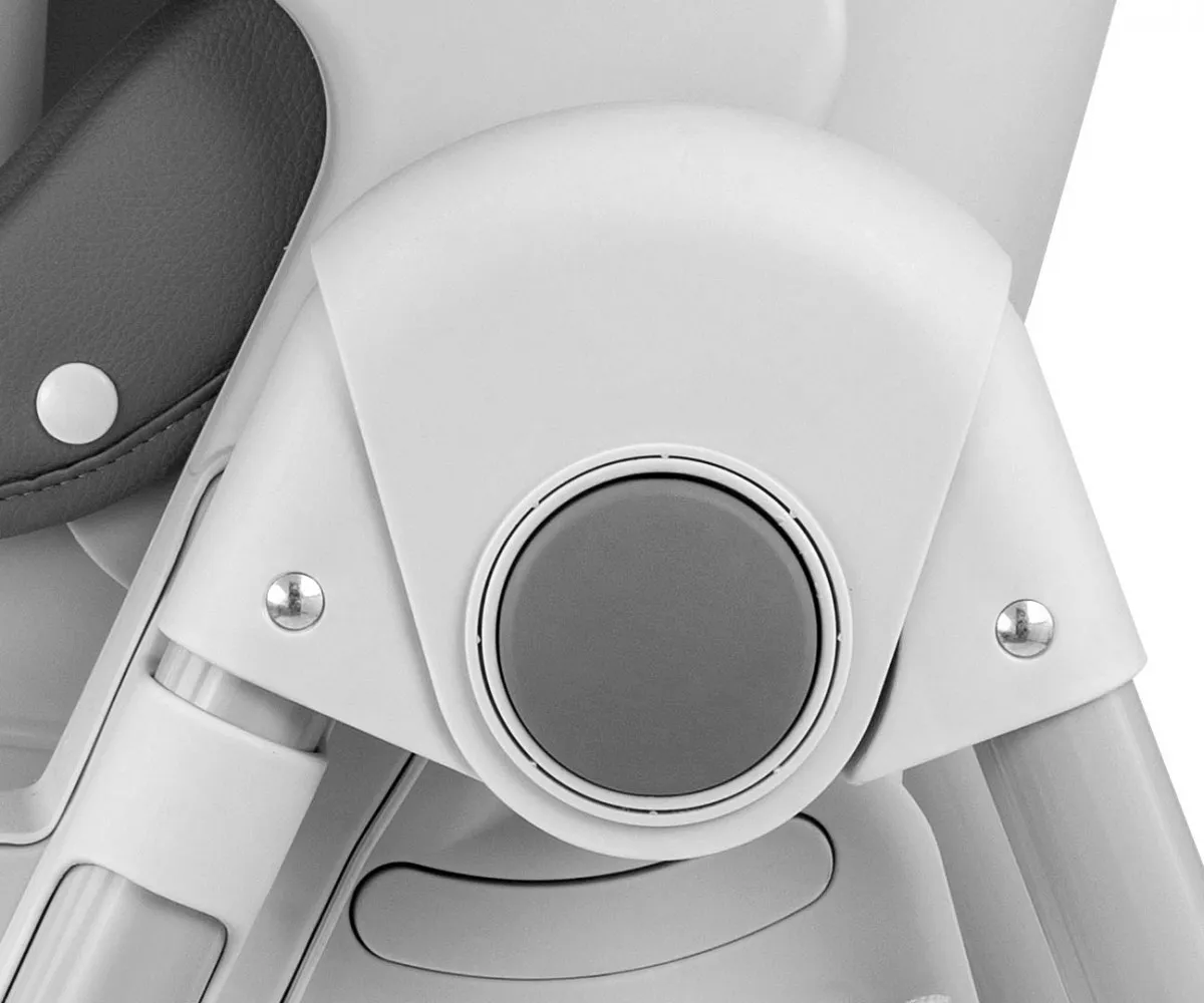Poszycie krzesełka wykonane jest z ekologicznej skóry i posiada dodatkową miękką wkładkę dla najmłodszych. Dla bezpieczeństwa dziecka wyposażone jest w 5-punktowe regulowane pasy oraz dodatkową barierę krokową, zabezpieczającą przed ześlizgnięciem. Wyposażone jest również w wypinaną tackę z nakładką. Z tyłu oparcia znajduje się mocowanie do zawieszenia tacki, gdy nie jest ona użytkowana. Oparcie i podnóżek mają możliwość rozłożenia do pozycji leżącej. Siedzisko można unosić bądź obniżać w 7 stopniowej skali a w nóżkach wbudowane są gumowe kółka. Całą konstrukcję łatwo i płynnie można złożyć do niedużych rozmiarów.