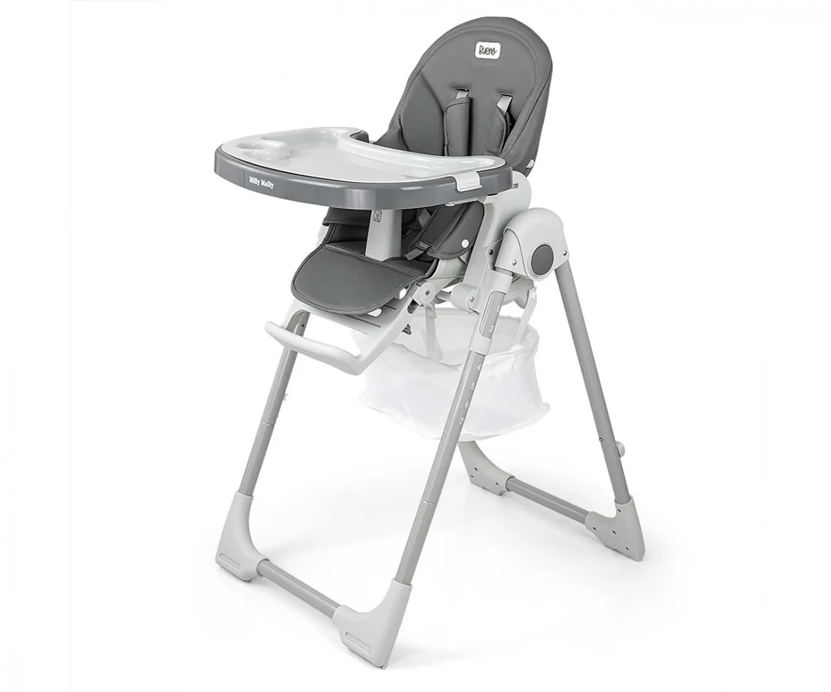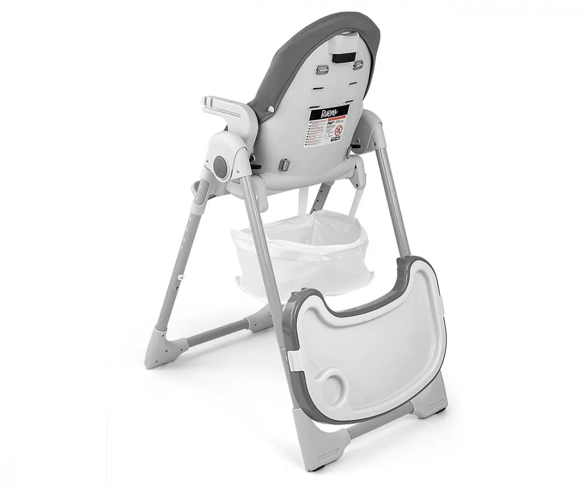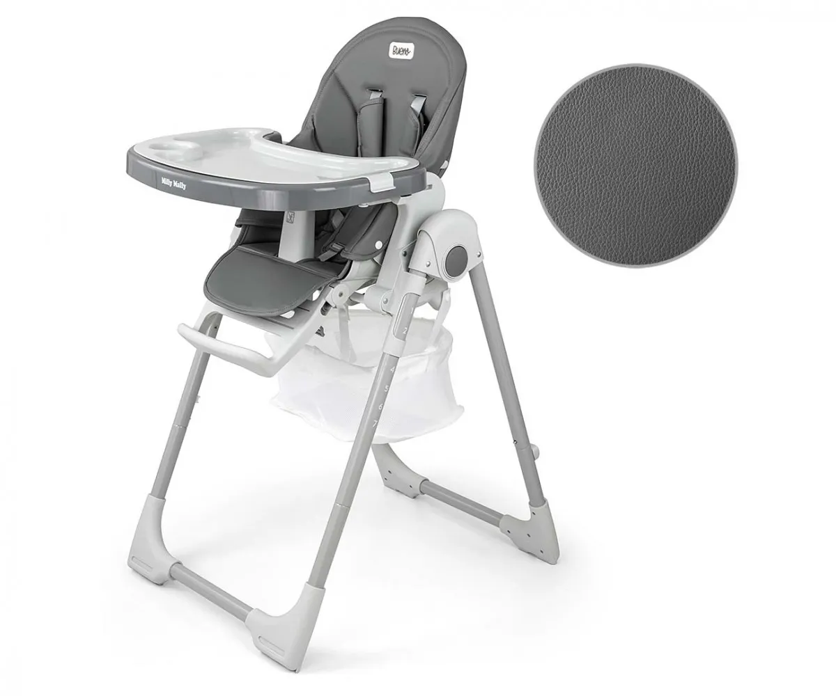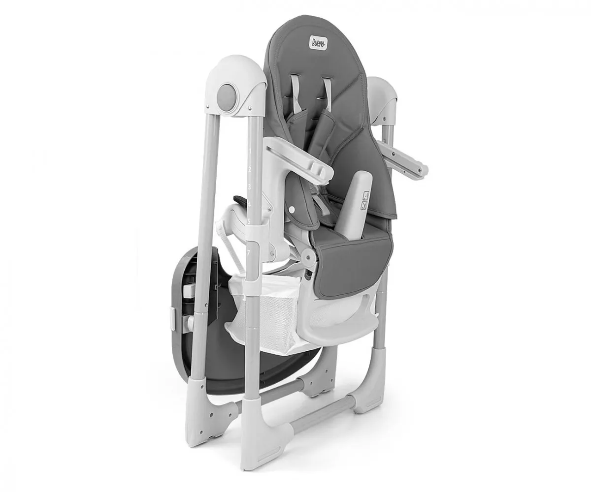 Poszycie krzesełka wykonane jest z ekologicznej skóry i posiada dodatkową miękką wkładkę dla najmłodszych. Dla bezpieczeństwa dziecka wyposażone jest w 5-punktowe regulowane pasy oraz dodatkową barierę krokową, zabezpieczającą przed ześlizgnięciem. Wyposażone jest również w wypinaną tackę z nakładką. Z tyłu oparcia znajduje się mocowanie do zawieszenia tacki, gdy nie jest ona użytkowana. Oparcie i podnóżek mają możliwość rozłożenia do pozycji leżącej. Siedzisko można unosić bądź obniżać w 7 stopniowej skali a w nóżkach wbudowane są gumowe kółka. Całą konstrukcję łatwo i płynnie można złożyć do niedużych rozmiarów.