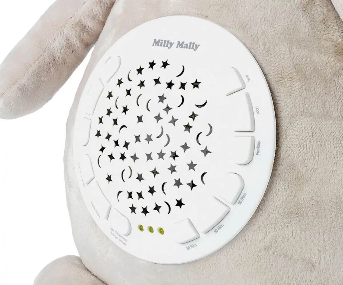 Zabawka pluszowa z projektorem-Milly to niezastąpione narzędzie dla rodziców, które jest pomocne przy uspokajaniu czy usypianiu niemowlaka. Po uruchomieniu projektora Milly usłyszymy 10 melodii kołysanek wybieranych losowo, jednocześnie będzie on wyświetlał nocne niebo.